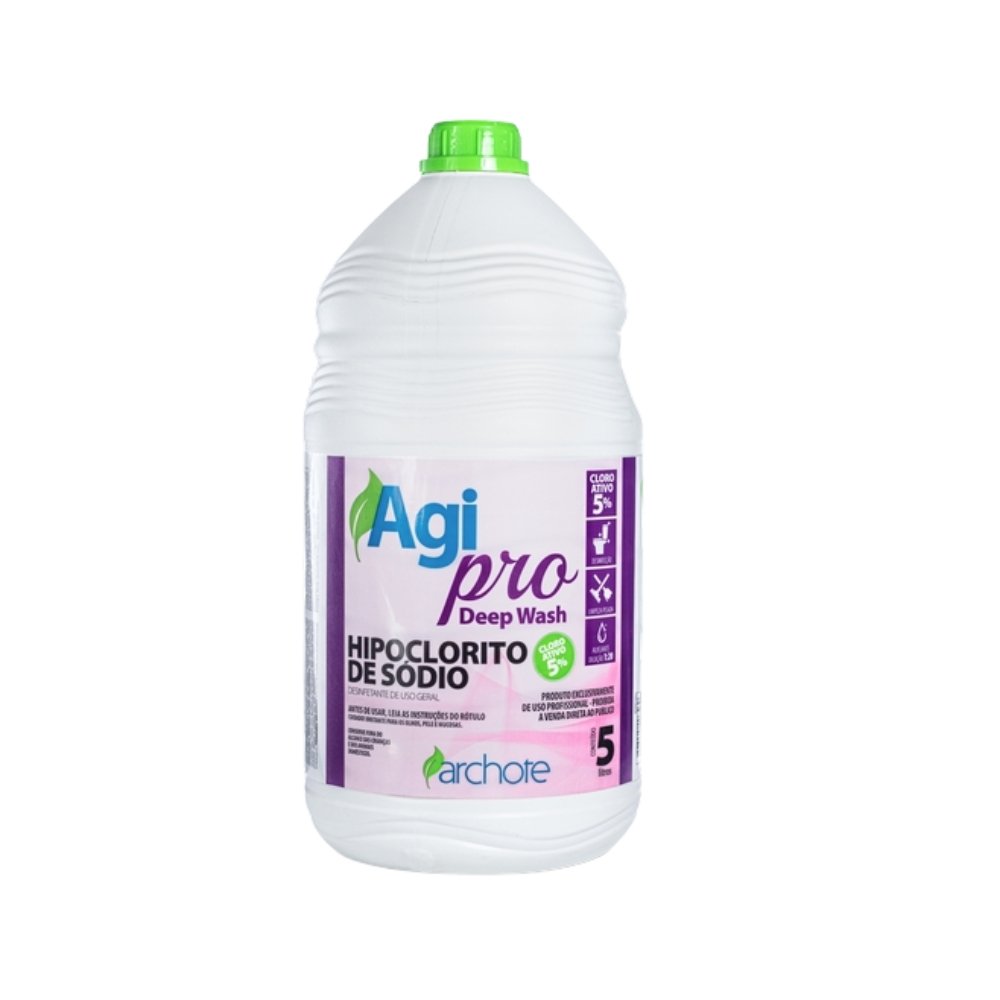 HIPOCLORITO DE SÓDIO AGIPRO DEEP WASH ARCHOTE 5L, LIMPEZA PESADA, DESINFECÇÃO E BRANQUEAMENTO DE TECIDOS. BACTERICIDA, ELIMINA GERMES, ODORES E MANCHAS