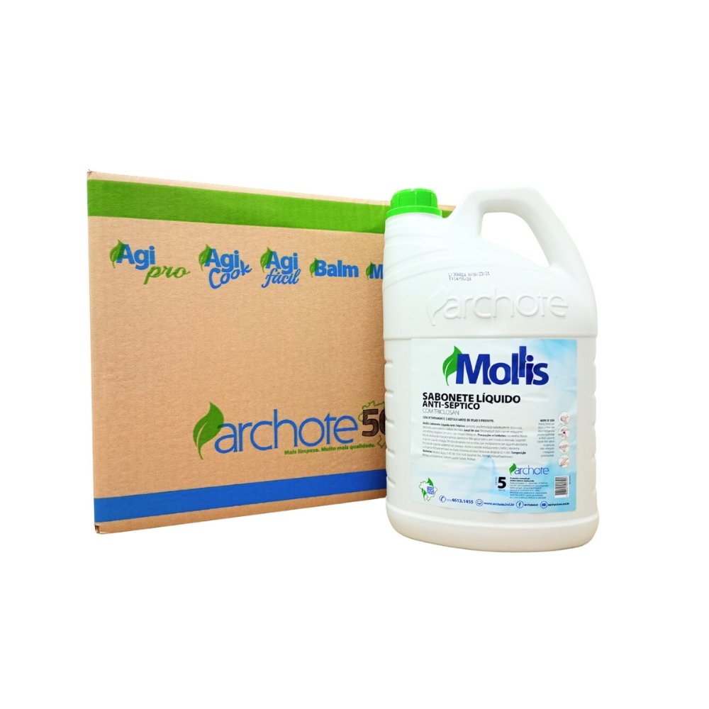SABONETE LÍQUIDO ANTI-SÉPTICO MOLLIS ARCHOTE 5L, HIGIENIZANTE E SUAVE PARA AS MÃOS. CAIXA COM 4 GALÕES, IDEAL PARA USO DOMÉSTICO E PROFISSIONAL.